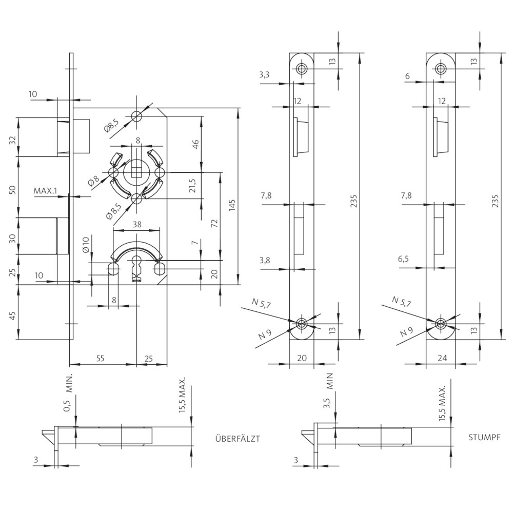 BKS Einsteckschloss 0215; Produkttyp: Einsteckschloss; Produkttyp (Hersteller): Zimmertürschloss; Ausführung: mechanisch; Verriegelung: manuell; Entriegelung: manuell; Drückernuss: einteilig; Stulpform: Flachstulp; Material Stulp: Edelstahl; Schlosskasten: geschlossen; Schlosskastenhöhe: 145 mm; Schlosskastenstärke: 15,5 mm; Norm: DIN 18251; Schlossklasse: Klasse 1; Türart: Vollblatt; Türflügelanzahl: einflügelig; Türwerkstoff: Holz,Stahl; Einsatzbereich: Gangflügel; Dornmaß: 55 mm; Hinterdornmaß: 25 mm; Drückernussvierkant: 8 mm; Entfernung: 72 mm; Lochung: Buntbart gelocht; DIN-Richtung: DIN Rechts; Stulpausführung: rund; Stulpbreite: 20 mm; Stulplänge: 235 mm; Stulpstärke: 3 mm; Farbton Stulp: edelstahl; Oberfläche Stulp: matt; Stulp Prägung: mit Logo; Material Falle: Zinkdruckguss; Schlossriegel: 1 tourig; Riegelausschluss: 10 mm; Einbautiefe Schlosskasten: 77 mm; Wechsel: ohne Wechsel