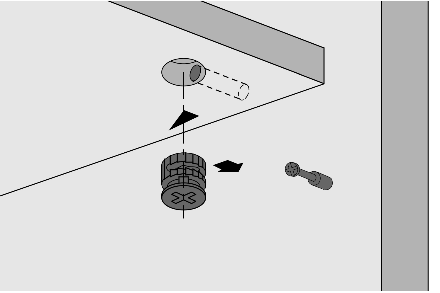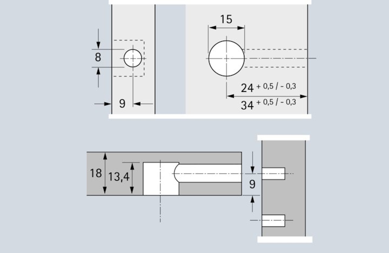 • Mit Anzugshilfe – Möbelseiten können so mit bis zu 4 mm Abstand zur Stirnseite des Fachbodens herangezogen werden • Doppelte Sicherheit durch Innen- und Außenrastung - der Dübel wird immer zentrisch angezogen, ein Versetzen der Möbelteile ist somit ausgeschlossen! • Exzenter kann mit Schlitzklinge, Kreuzschlitzklinge PZ 3 oder Sechskantschlüssel SW 4 verspannt werden • Mit und ohne Abdeckrand, der Abdeckrand verdeckt unsaubere Bohrungen, eine zusätzliche Abdeckkappe ist nicht erforderlich • Zinkdruckguss