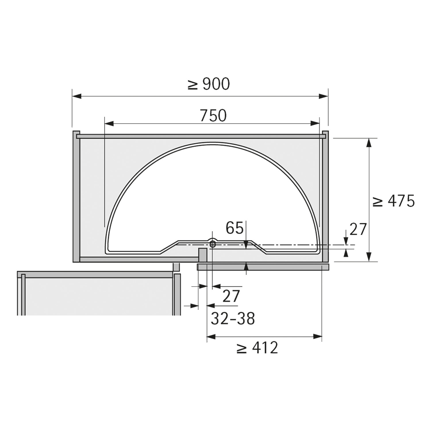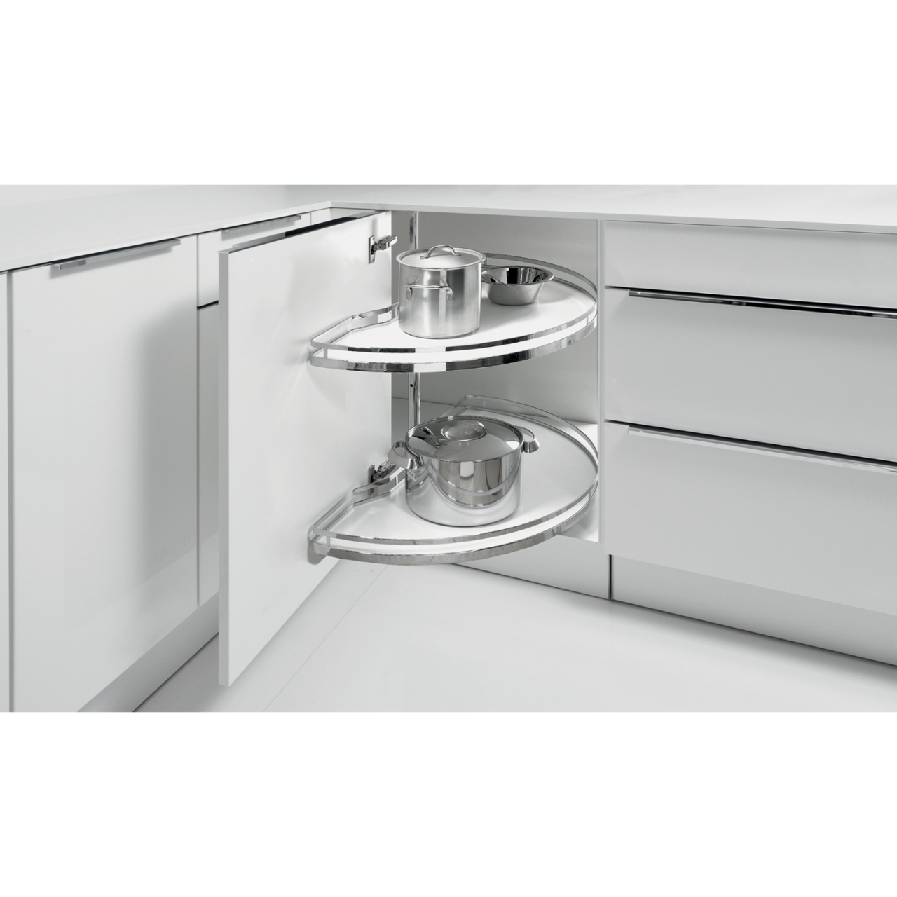 • Für Eckunterschränke, Korpusmaß 900 mm oder 1000 mm • Einbauhöhe 730 mm • Achse individuell kürzbar • Befestigung der Lager am Eckpfosten • Höhenpositionierung der Drehböden schnell und einfach über umsteckbare Auflager • Belastbarkeit 15 kg / Boden • Arena STYLE / CLASSIC Halbkreisdrehböden Holzboden, melaminharzbeschichtet weiß mit rutschhemmender Speziallackierung • Reling Stahl verchromt Set besteht aus: