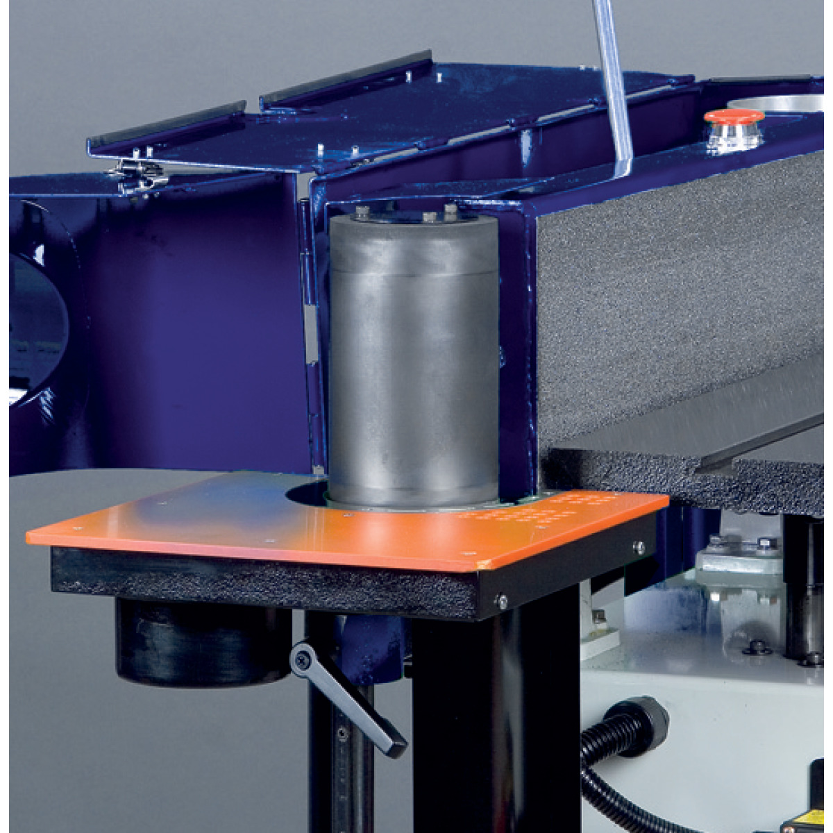 - Schleifhülsen-Einrichtung inkl. drei Gummiwalzen (Ø 38/50/76 mm), drei Schleifhülsen (Schleifbreite: 100mm), vier Tischeinlagen und höhenverstellbarem Tisch mit Absaugvorrichtung