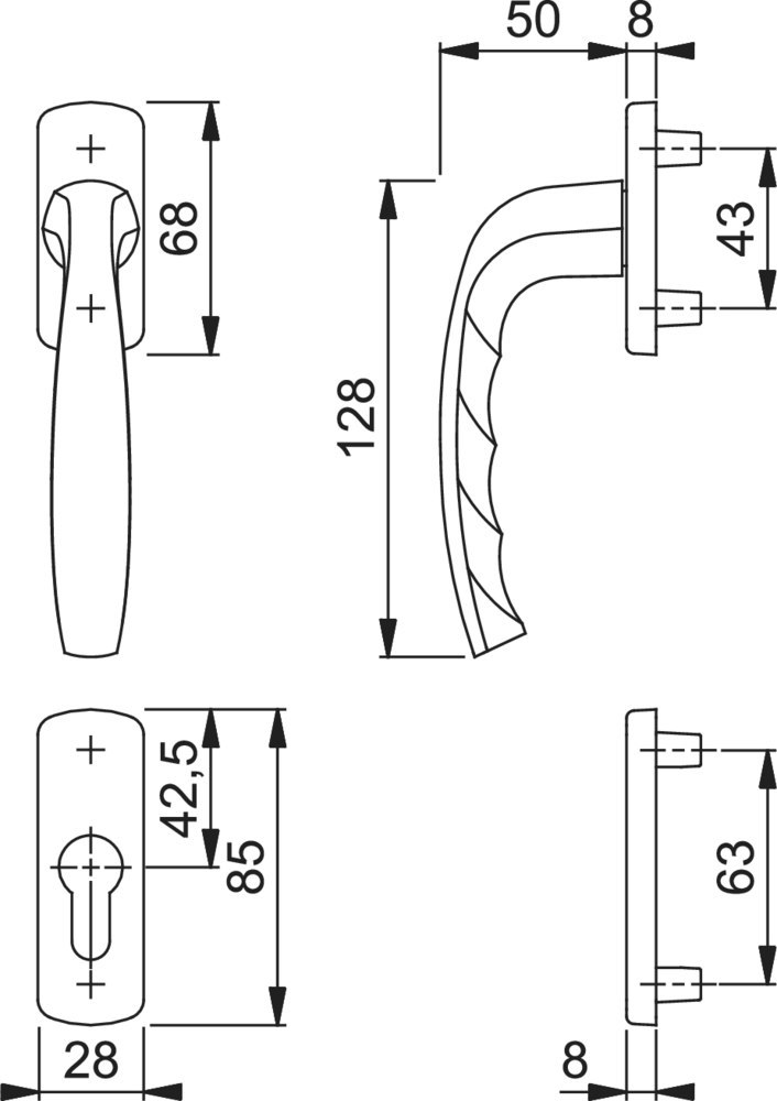 HOPPE Halbgarnitur New York 0810/961N/962NS; Ausführung: abschließbar,mit Rosetten; Material: Aluminium; Vierkant: 7 mm; Rastung: ohne Rastung; Befestigungsart: verdeckt verschraubt; Befestigungstechnik: mit Stütznocken; Lieferung: mit Vierkantstift,ohne Schrauben; Einsatzbereich: Fenstertür; Basis: Halbgarnitur; Farbe: grau; DIN-Richtung: DIN Links-Rechts; Modellnummer: 0810/961N/962NS; Nockendurchmesser: 10 mm; Sockelbreite: 29 mm; Sockelhöhe: 68 mm; Sockelstärke: 8 mm; Befestigungsabstand: 43 mm; Farbton: stahlfarbig; Lochung: Profilzylinder gelocht; Sockelausführung: mit kantig abgerundeter Rosette; Griffform: gebogen; Grifflänge außen: 128 mm; Griffhöhe außen: 50 mm; Breite Schlüsselrosette außen: 28 mm; Länge Schlüsselrosette außen: 85 mm; Außengriff/Innengriff: außen Standard; Funktion: Standard; Fensterwerkstoff: Holz,Aluminium,Kunststoff; Aufdruck: mit Logo