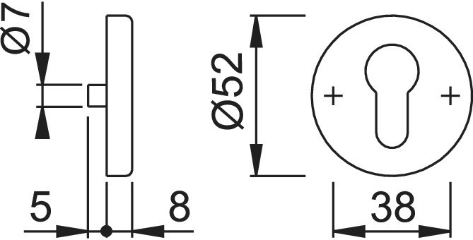 HOPPE Schlüsselrosettenpaar E42S; Produkttyp: Schlüsselrosettenpaar; Produkttyp (Hersteller): Schlüsselrosettenpaar; Anwendung: außen/innen; Form: rund; Befestigungsart: verdeckt verschraubt; Material: Edelstahl; Durchmesser: 52 mm; Material Unterkonstruktion: Stahl; Einsatzbereich: Tür; Türart: Vollblatt; Lochung: Profilzylinder gelocht; Farbe: grau; Farbton: edelstahl matt; Stütznocken: mit Stütznocken; Höhe: 8 mm
