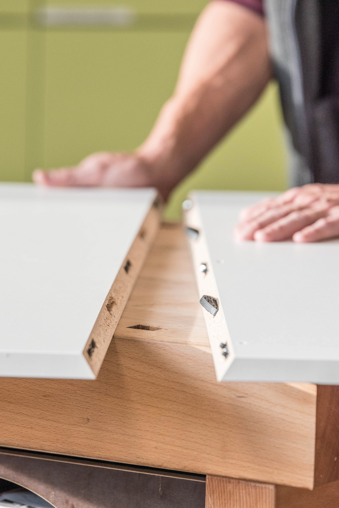 Bisco P ist eine Kunststofflamelle, welche in die 7 mm P-System Nut passt und aufgrund ihrer Oberflächenstruktur in der Nut festklemmt. Bisco P wird in Kombination mit Clamex oder Tenso als kostengünstiges Richtelement eingesetzt und sorgt für Bündigkeit der Fuge. Eine weitere Anwendung ist der Einsatz als Trockenverbindung, bevor ein Werkstück mit Tenso P und Klebstoff fix verbunden wird. Bisco P-14 wird in Kombination mit Clamex P-14 oder Tenso P-14 eingesetzt, Bisco P-10 mit den Verbindern in Grösse P-10.